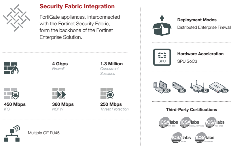 The FortiGate 80E Series includes a USB port that allows you to plug in a compatible third-party 3G/4G USB modem, providing additional WAN connectivity or a redundant link for maximum reliability.Compact and Reliable Form Factor