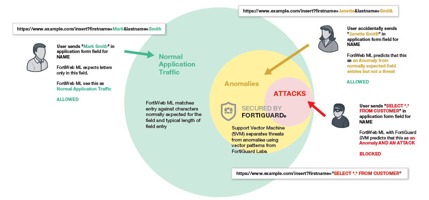FortiWeb’s AI-based machine learning addresses false positive and negative threat detections without the need to tediously manage whitelists and fine-tune threat detection policies. With near 100% accuracy, the dual layer machine learning engines detect anomalies and then determine if they are threats unlike other methods that block all anomalies regardless of their intent